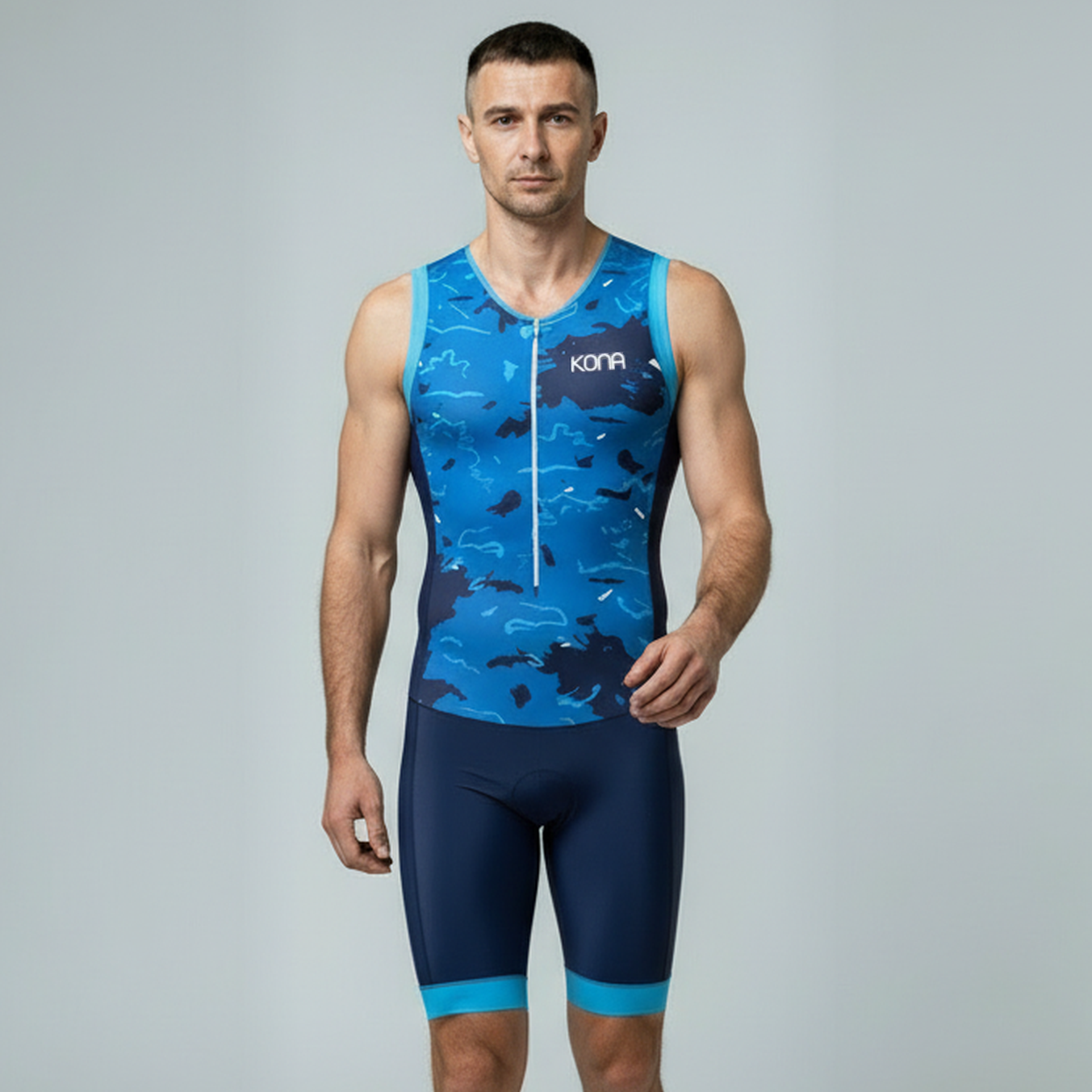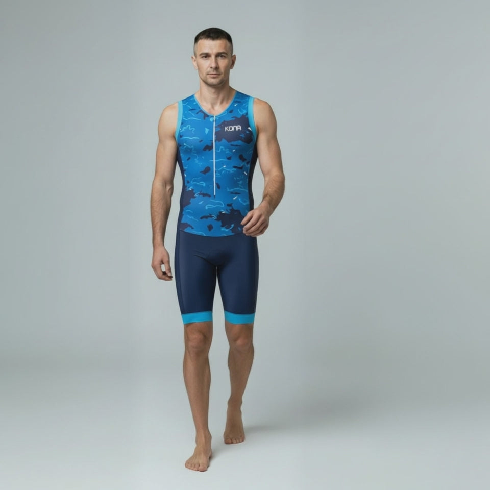 This sleeveless, one-piece triathlon suit is designed for athletes who want comfort, mobility, and practical storage from swim start to final run.